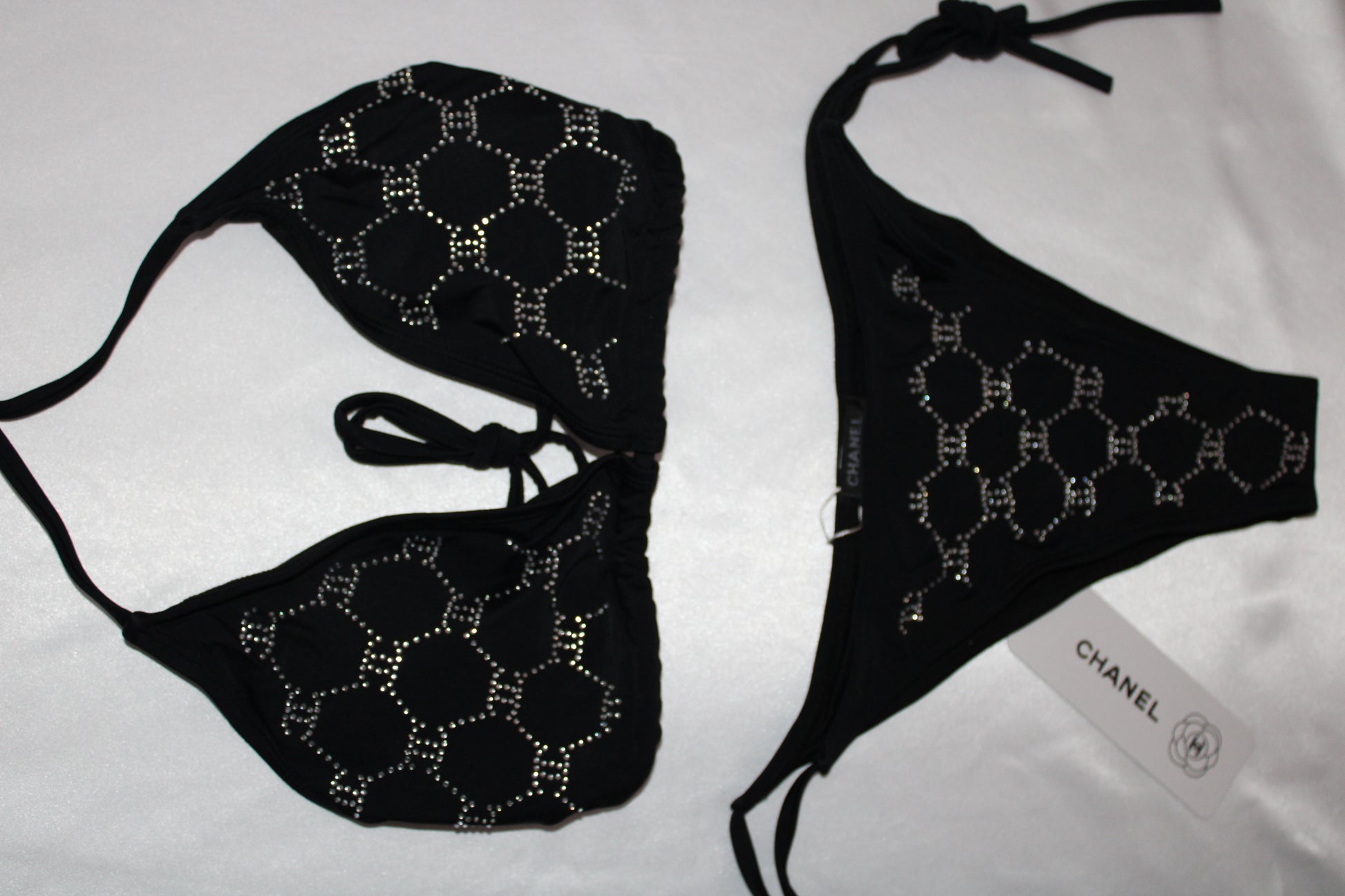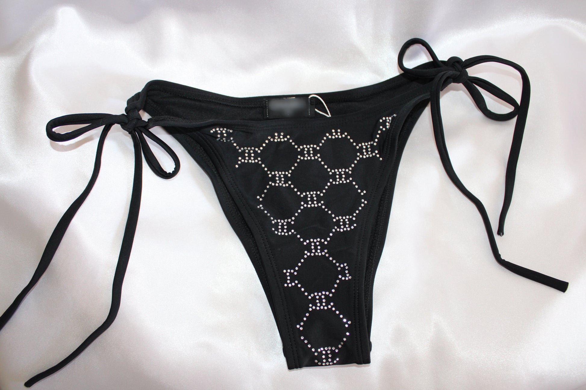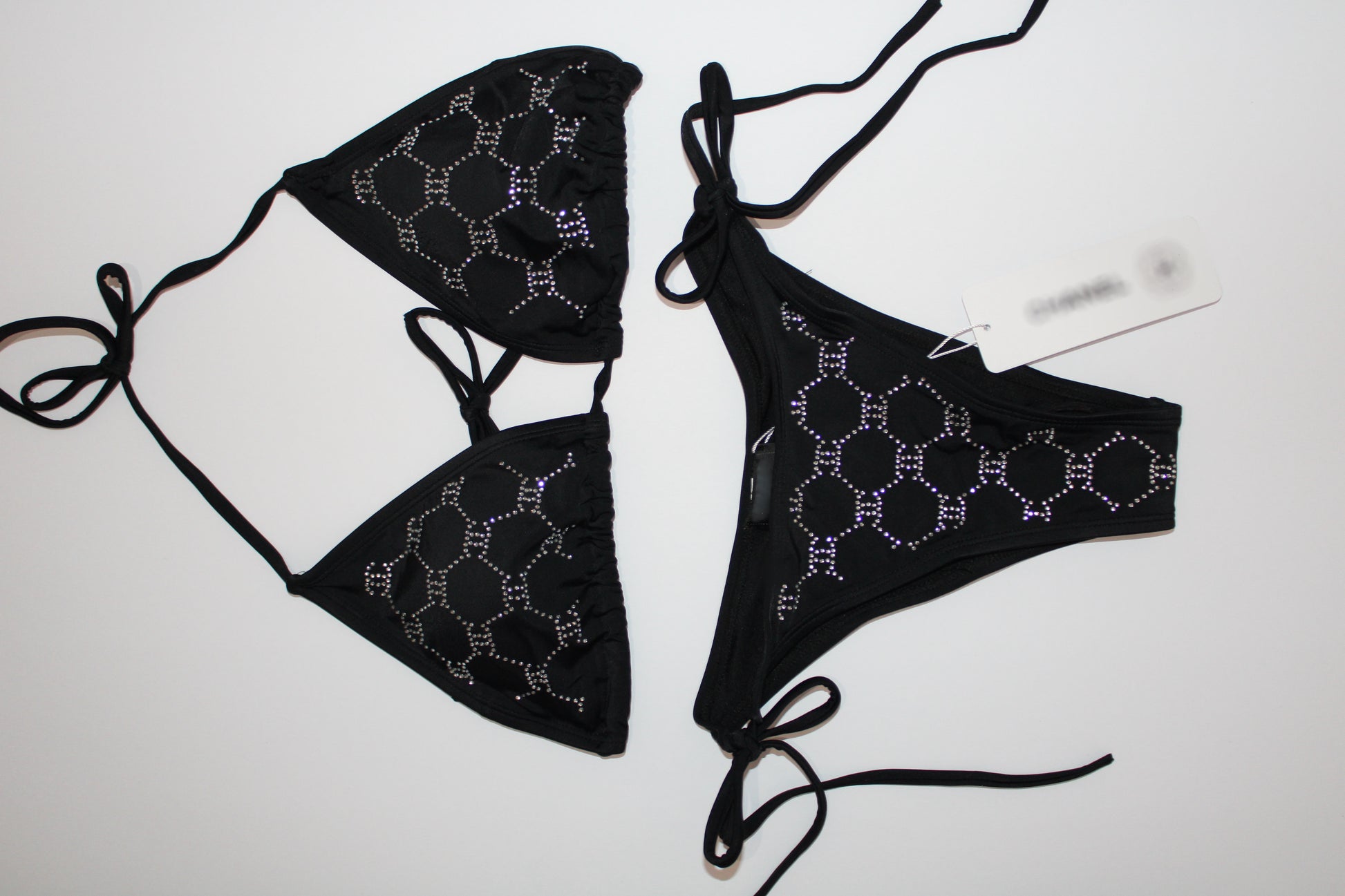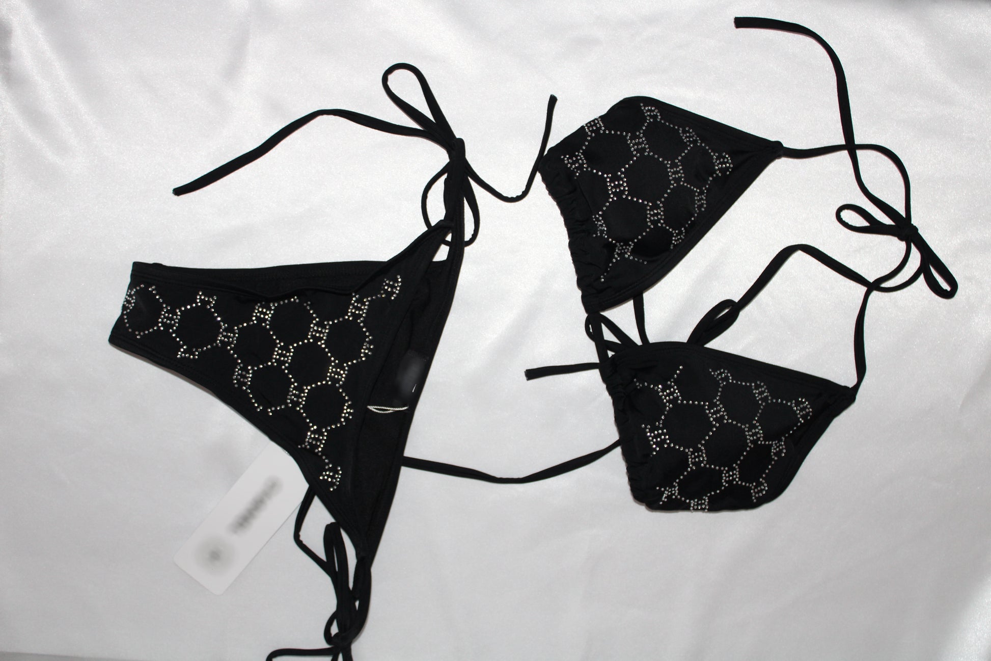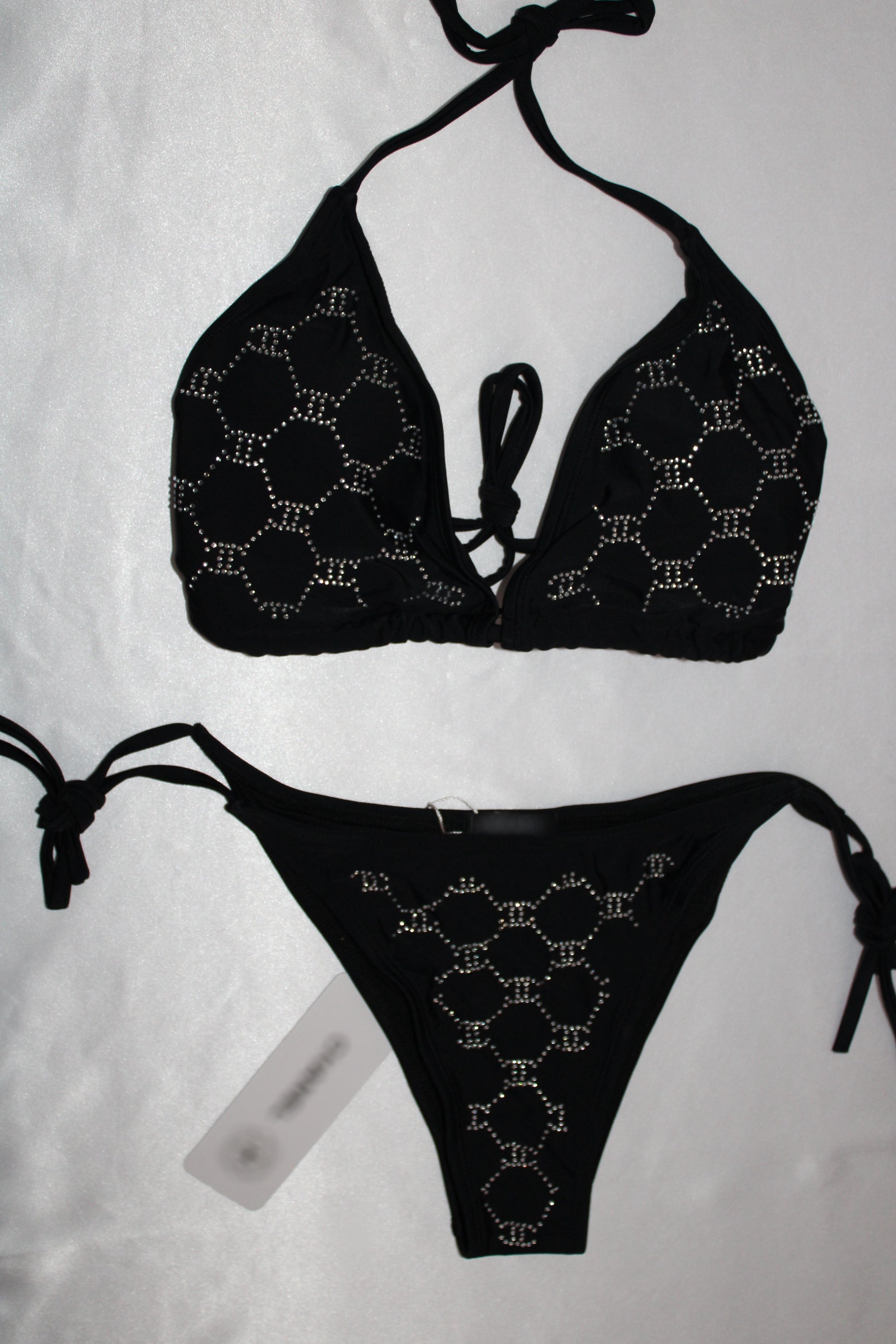 Turn heads with this stunning black bikini set, featuring a sleek triangle top and matching bottom adorned with dazzling crystal embellishments in a modern hexagonal pattern. The minimalist silhouette is elevated by the intricate sparkle detailing, offering a perfect balance of sophistication and glamour. Designed with adjustable tie straps for a customizable fit, this set is ideal for luxurious beach days or poolside lounging. Crafted from high-quality stretch fabric, it ensures both comfort and style for the fashion-forward sunseeker.